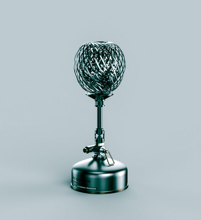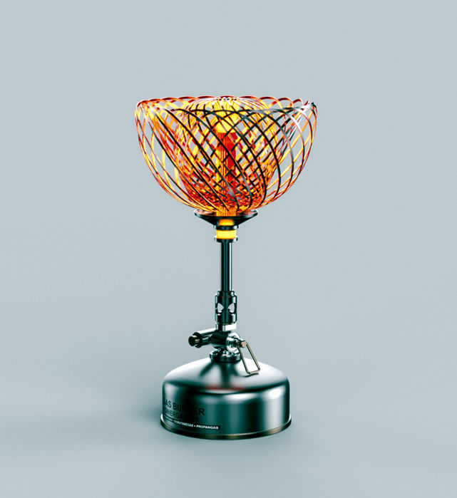 A tool that warms the body by converting the flame of a single burner into far-infrared heat. The metal plate emitting the heat glows red, providing a comforting visual effect. A bimetallic sheet made of two pieces of metal glued together takes advantage of the varying expansion rates of the different metals, allowing the sheet to change shape with the heat. The small ball-shaped bimetal at the end rotates and opens like a flower, eventually transforming into a large flame shape.